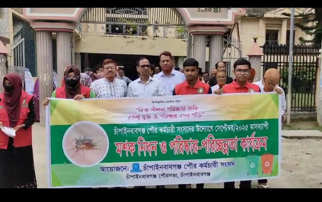 চাঁপাইনবাবগঞ্জ পৌরসভায় পৌর কর্মচারী সংসদের উদ্যোগে ১৭ই সেপ্টেম্বর রোজ মঙ্গলবার সকাল ১০ ঘটিকায় পৌর চত্তর থেকে মশক নিধন ও পরিষ্কার-পরিচ্ছন্নতা কার্যক্রম বাস্তবায়নে পৌরসভার প্রধান প্রধান সড়কে র্যালি ও লিফলেট বিতরণ করেন। চাঁপাইনবাবগঞ্জ পৌরসভার এই মহৎ কার্যক্রম উদ্বোধন করেন চাঁপাইনবাবগঞ্জ পৌরসভার নির্বাহী প্রকৌশলী মোঃ তৌফিকুল আলম। উক্ত র্যালিতে "নিজ সীমানা পরিষ্কার করি,ডেঙ্গু মুক্ত ও পরিচ্ছন্ন নগর গড়ি" স্লোগানের মধ্য দিয়ে আশেপাশে সকল জনগণের হাতে লিফলেট তুলে দেন পৌর কর্মচারী সংসদ। র্যালি শেষে পৌরসভায় হলরুমে আলোচনা সভার আয়োজন করেন চাঁপাইনবাবগঞ্জ পৌরসভার পৌর কর্মচারী সংসদ। উক্ত আলোচনা সভায় সভাপতিত্ব করেন চাঁপাইনবাবগঞ্জ পৌরসভার পৌর কর্মচারী সংসদের সভাপতি মোঃ এনামুল হক। উক্ত আলোচনা সভায় প্রধান অতিথি হিসেবে ছিলেন চাঁপাইনবাবগঞ্জ পৌরসভার নির্বাহী প্রকৌশলী মোঃ তৌফিকুর ইসলাম। প্রধান অতিথি বক্তব্য দেন, চাঁপাইনবাবগঞ্জ পৌরসভার পৌর কর্মচারী সংসদের পক্ষ থেকে মাসব্যাপী পরিষ্কার- পরিচ্ছন্নতা ও বর্জ্য অপসারণ কাজ সহ ডেঙ্গু নিধন কার্যক্রম (ক্রাস প্রোগাম) শুরু হয়েছে। আমাদের সকলের দায়িত্ব পৌরসভাকে সুন্দর রাখা এবং স্বাস্থ্যকর পরিবেশ বজায় রাখা। চাঁপাইনবাবগঞ্জ পৌরবাসীর কাছে সহযোগিতা চেয়েছেন। উক্ত অনুষ্ঠানে আরোও উপস্থিতবর্গ বক্তব্য রাখেন,চাঁপাইনবাবগঞ্জ পৌরসভার পৌর কর্মচারী সংসদের সাধারণ সম্পাদক আব্দুল আজিজ খান, চাঁপাইনবাবগঞ্জ পৌরসভার পৌর নির্বাহী কর্মকর্তা মামুন- অর- রশীদ,চাঁপাইনবাবগঞ্জ পৌরসভা হিসাব রক্ষক কর্মকর্তা মোঃ আহসান হাবিব,চাঁপাইনবাবগঞ্জ পৌরসভা সেনেটারী ইন্সপেক্টর মোঃ গোলাম ফারুক চাঁপাইনবাবগঞ্জ পৌরসভার কনজারবেন্সী ইন্সপেক্টর মোঃ রোজিবুল হক সহ উপস্থিত ছিলেন সকল চাঁপাইনবাবগঞ্জ পৌর- কর্মচারী সংসদ।