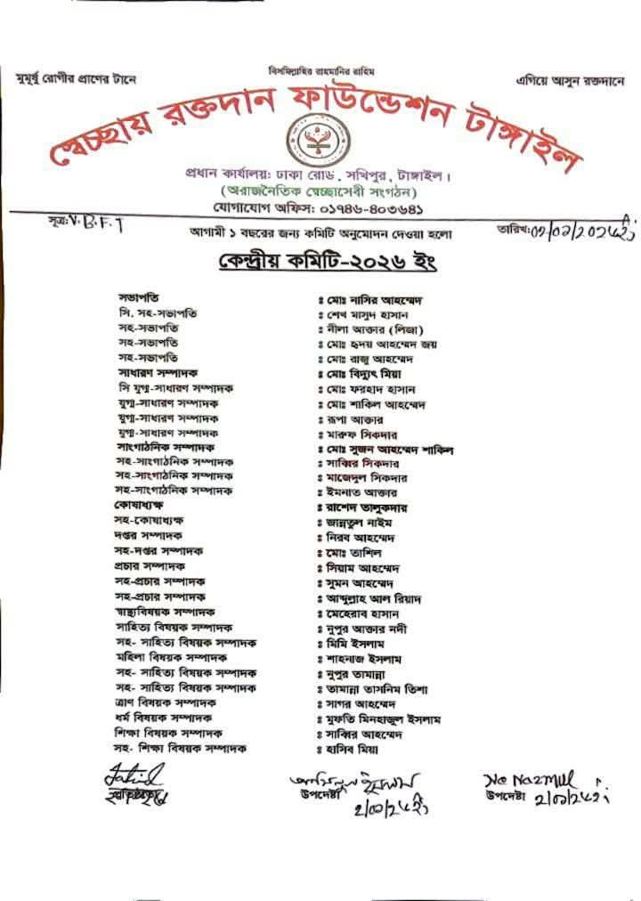 স্বেচ্ছায় রক্তদান ফাউন্ডেশন, টাঙ্গাইল-এর কেন্দ্রীয় কমিটি–২০২৬ অনুমোদিত